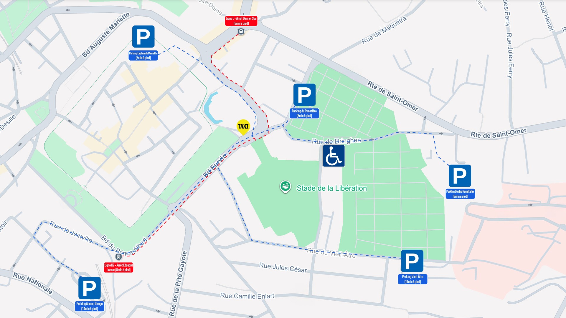Aux abords du Stade de la Libération, 9 parkings sont disponibles pour vous accueillir dont 2 dédiés :